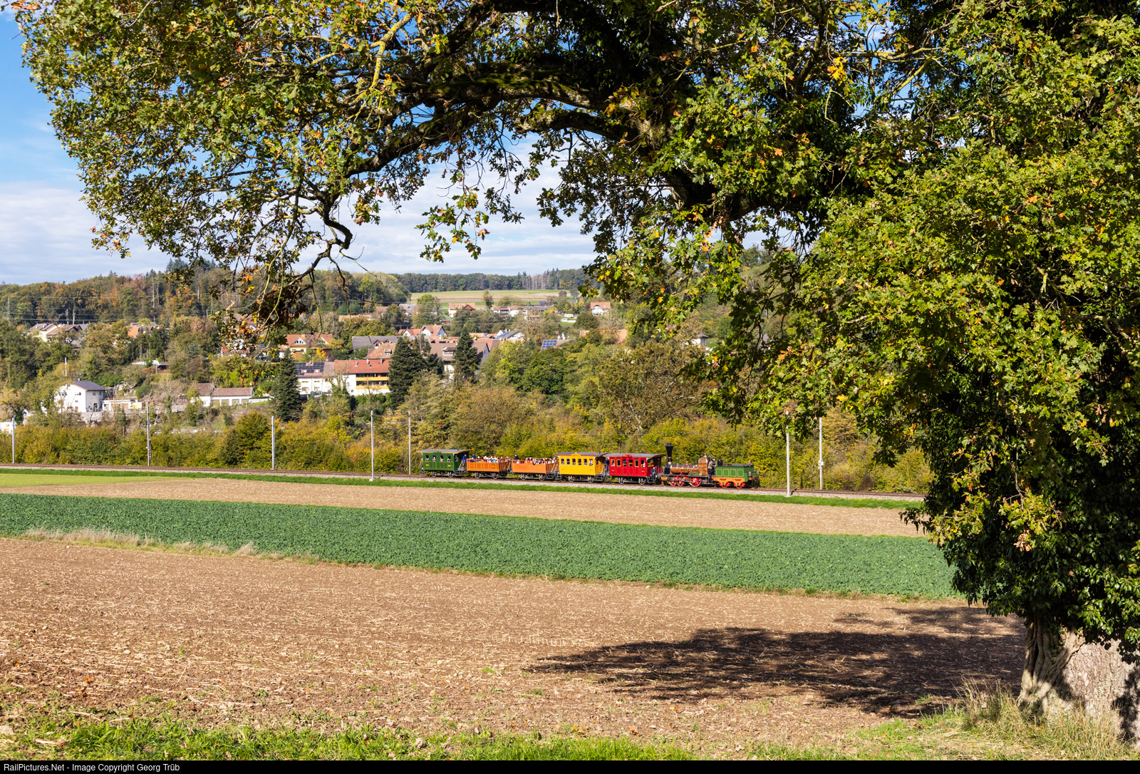 Steamtrain with the "Spanisch-Brötli-Bahn", nickname of the first railway in Switzerland, celebrating 175 years railways in Switzerland. Locomotive D 1/3 # 1 "Limmat" is running from Laufenburg to Koblenz, between Etzgen and Schwaderloch. The houses in the background are in Germany, the border river Rhine is not visible between.