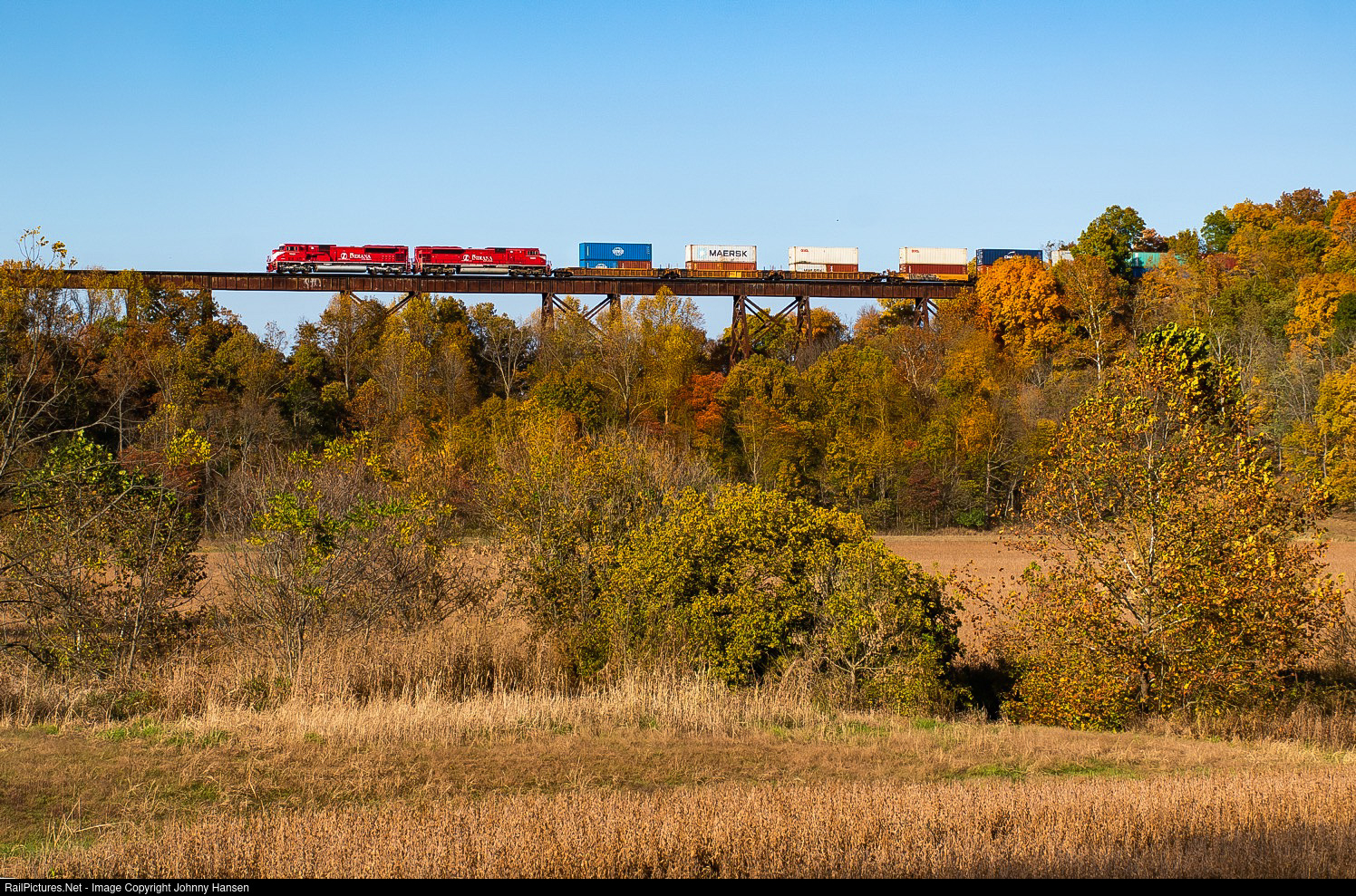 It’s a gorgeous afternoon in Southern Indiana during the beginning of fall peak as Indiana Rail Road’s train SAHW (Senate Ave - Palestine) makes it’s way towards Palestine with a duo of Indiana Rail Road SD9043MACs, #9010 and #9009. The train is seen here beginning its trek over the 117 year old Tulip Viaduct. The trestle Itself Is famous to the State of Indiana; as It was built in 1905 by the Indianapolis Southern Railway, which became part of the Illinois Central Railroad in 1911. It is 2,295 feet in length and is the biggest railroad bridge in all of Indiana. The Tulip Trestle is the biggest trestle along the old Illinois Central Hi-Dry Line as well. The Indianapolis District of the former Illinois Central was known as the “Hi-Dry Line” for many high fills and bridges/trestles, which makes the line very photogenic, which is why I love making the 5 hour drive to Southern Indiana every fall for fall colors and perfect light SD90’s, which has been a tradition for me for years.