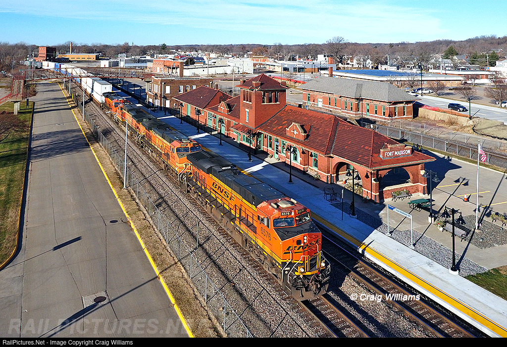 The city, IDOT, the FRA, and Amtrak all have chipped in restore service the old 111 year old ex-ATSF depot at Fort Madison. The station is now the regular stop for Amtrak's Southwest Chief. Its been five decades since a passenger train has stopped here, but mid-December changed all that when the new stop became open. Here a hot San Bernardino Z heads towards the Mississippi River Bridge and a departure out of Iowa and into Illinois for the final 220 miles into Willow Springs near Chicago. A new crew is only a mile into the trip east.