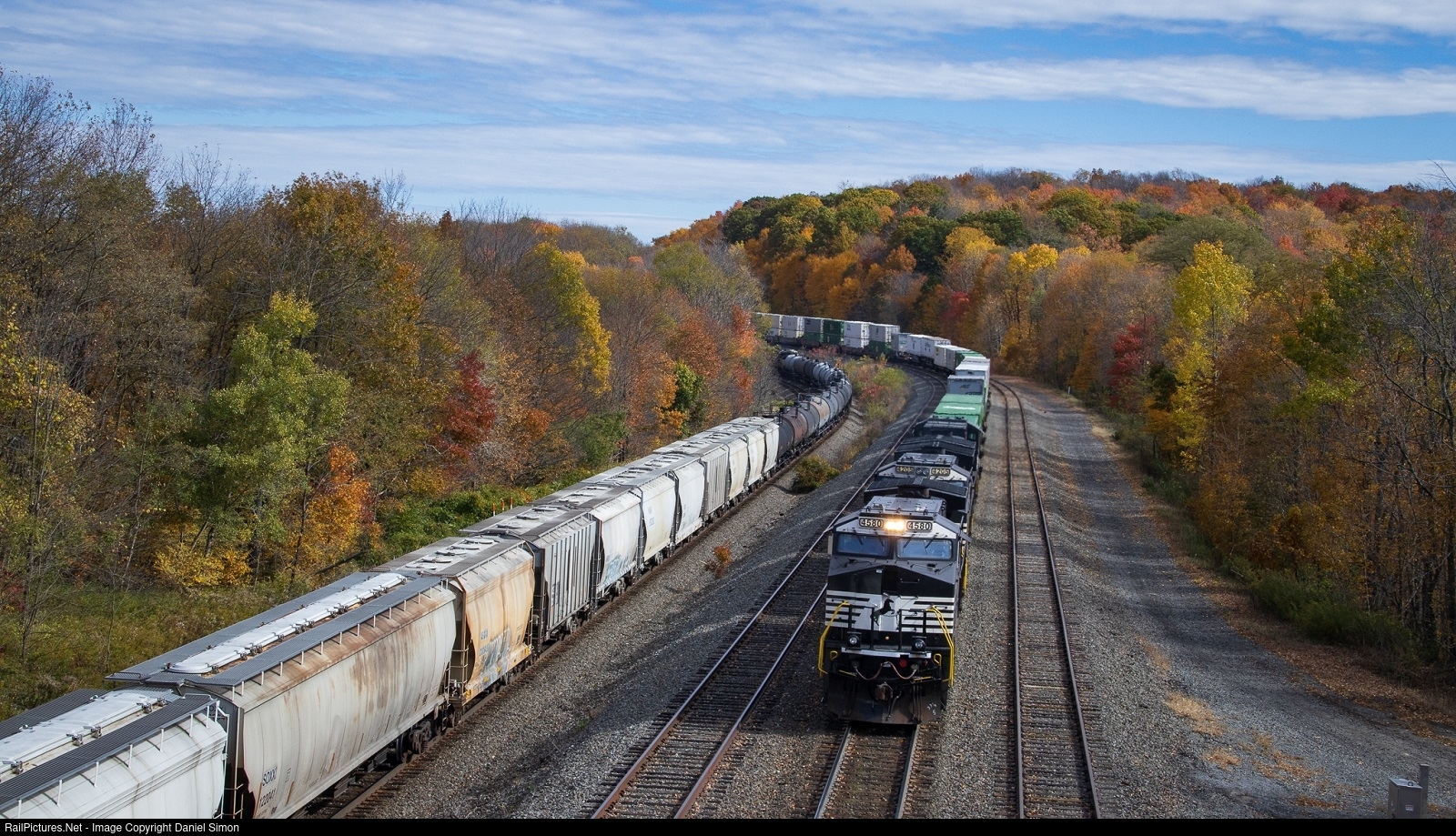 Its a beautiful fall afternoon on the Norfolk Southern Pittsburgh Line as NS train 25G (Morrisville, PA-Chicago, IL intermodal) overtakes a slower NS train 13V (Enola, PA to Conway, PA manifest) just outside of Cresson, PA.