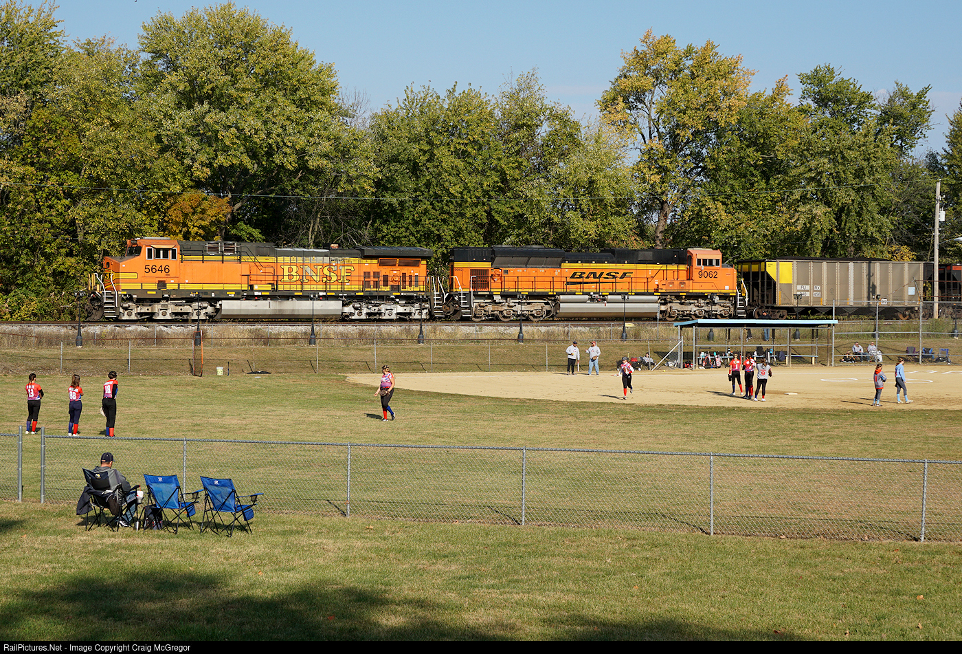 A girls softball team warms up for their game as a BNSF coal train rumbles by.