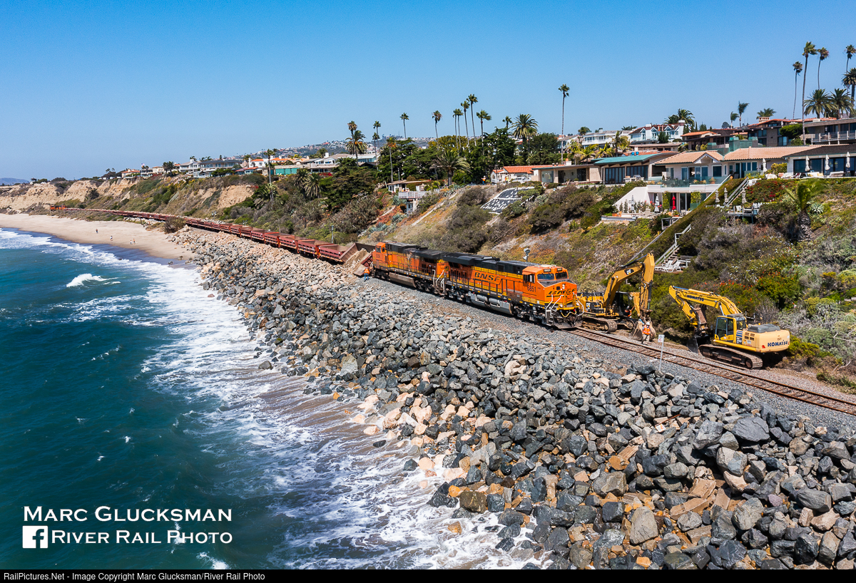 Rocky Route. On September 18, 2021, BNSF 6851 (ES44C4) led a rock train W-SBDSBD down the shores of the Pacific Ocean at Calafia Beach in San Clemente, California. Due to erosion that had been found, the line was closed to Amtrak and Metrolink passenger trains while a number of trains were brought in to secure the shore line. About a year later in 2022, the area is under a similar shutdown while other measures are taken to secure the track and surrounding land. In this photo, one can see the car dumping the rock from the train as well as the excavators that have been brought in to place them in a more stable location.