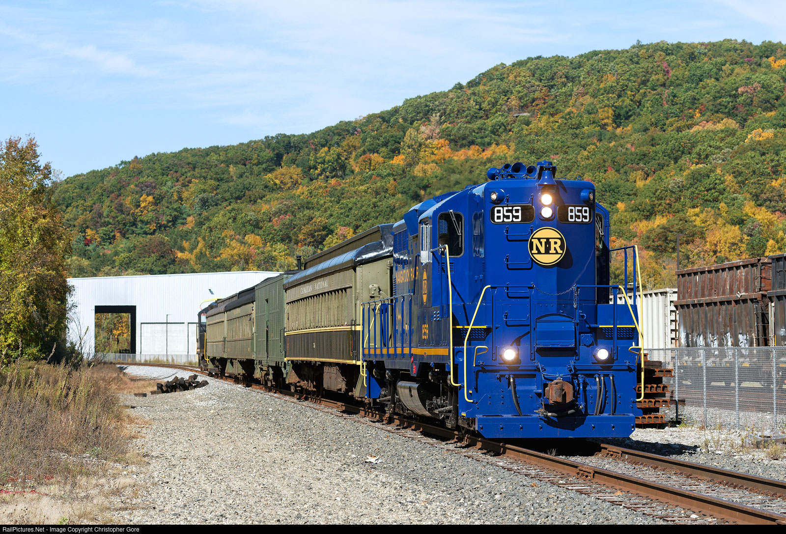 Naugatuck GP9 859 leading a fall foliage excursion from the Railroad Museum of New England.