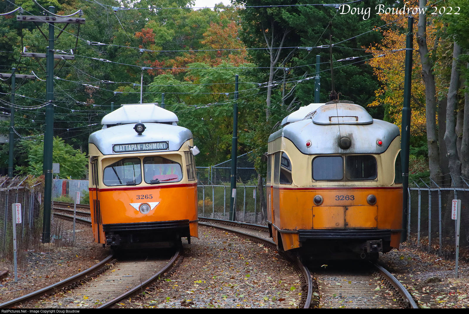 | Two of the historic Pullman-Standard PCC cars in service for the MBTA are seen arriving and departing Milton Station. These wartime PCCs were built in 1945-1946 and are in service on a section of track known as the Mattapan High-Speed Line. The 2.54 Mile loop connects the Ashmont and Mattapan neighborhoods of Boston cutting through the neighboring community of Milton. There was talk of replacing these antique cars with newer trolleys or electric busses, however, community leaders stepped in and convinced the MBTA to refurbish the existing historic cars. There are five active PCCs on the roster and five inactive units. Two of those units were damaged beyond repair in a 2017 accident. Car 3265 was recently refurbished and was the first to undergo such work. |