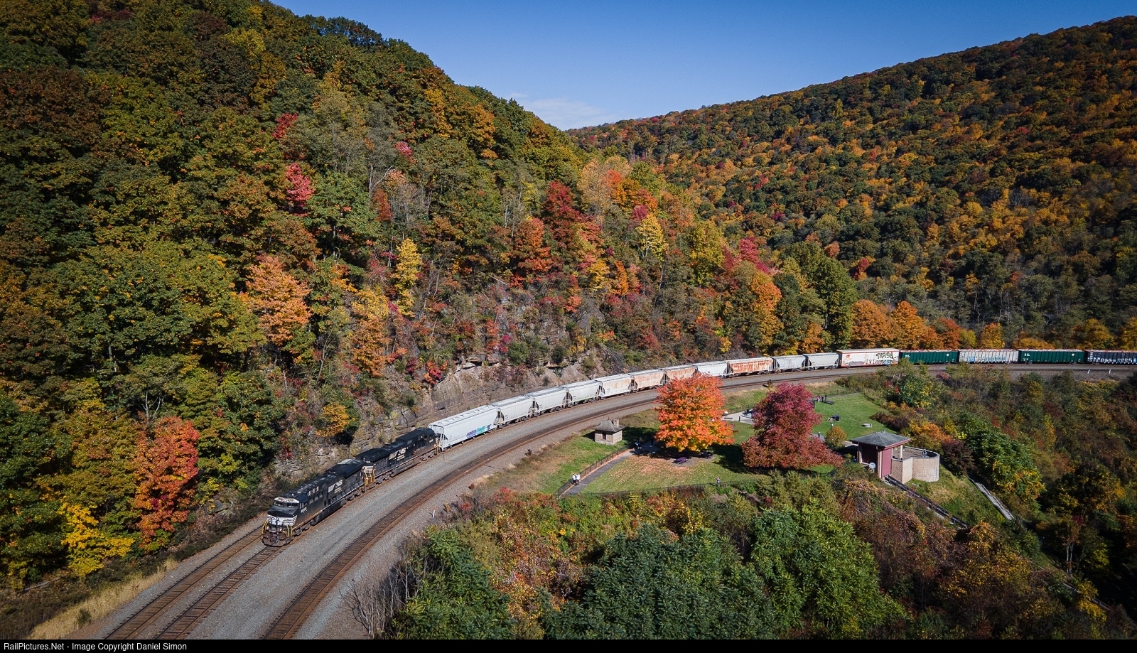 On a beautiful fall morning, Norfolk Southern train 11K (Allentown, PA-Conway, PA manifest) slowly bends around the trackside observation park at the world-famous Horseshoe Curve near Altoona, Pennsylvania. The NS Pittsburgh line is well-known among railfans as the most active line in the Norfolk Southern System. The most well-known spot along it by far is Horseshoe Curve. Here, the line makes a complete 180 degree U-turn, allowing visitors in the park to see a train wrap completely around them. The curve was completed in 1854 as a way of reducing the grade up the Alleghany Mountains of the then Pennsylvania Railroad Mainline. Since then, the curve has passed under the ownership of three more railroads, The Penn Central Transportation Company, Conrail, and Norfolk Southern.
