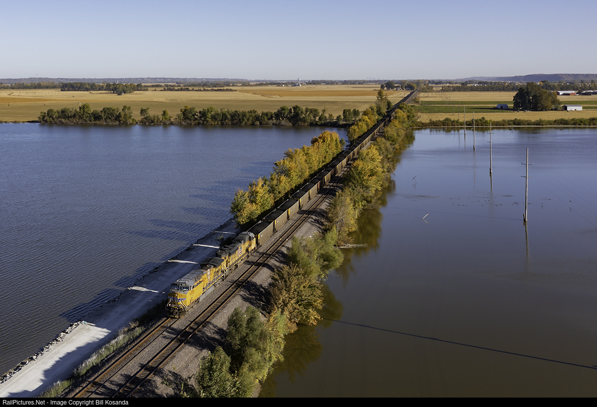 A former SP AC4400 leads a coal train south across Lake Moredock.