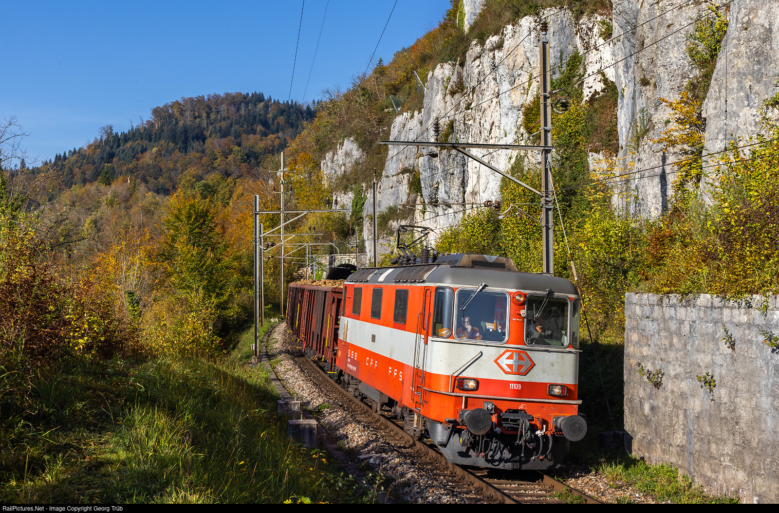 | Re 420 # 109 (Re 4/4 II # 11109) of the SBB in the Swiss Express paint scheme (only operational left), rented to the Chemins de Fer du Jura/Jura Railways (CJ) for about 2 weeks, is entering St-Ursanne with the sugar beet train 69441 from Alle Cargo via Porrentruy to Delémont. The train with 8 loaded Eas cars is leaving the 228 meter long Chàteau tunnel. |