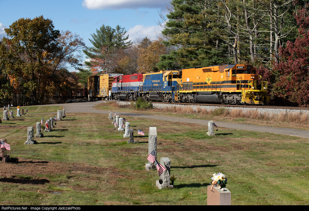 NECR tunnel motor 3317 leads train 608 south through St. Edwards cemetery in Stafford Springs on their way to Willimantic.
