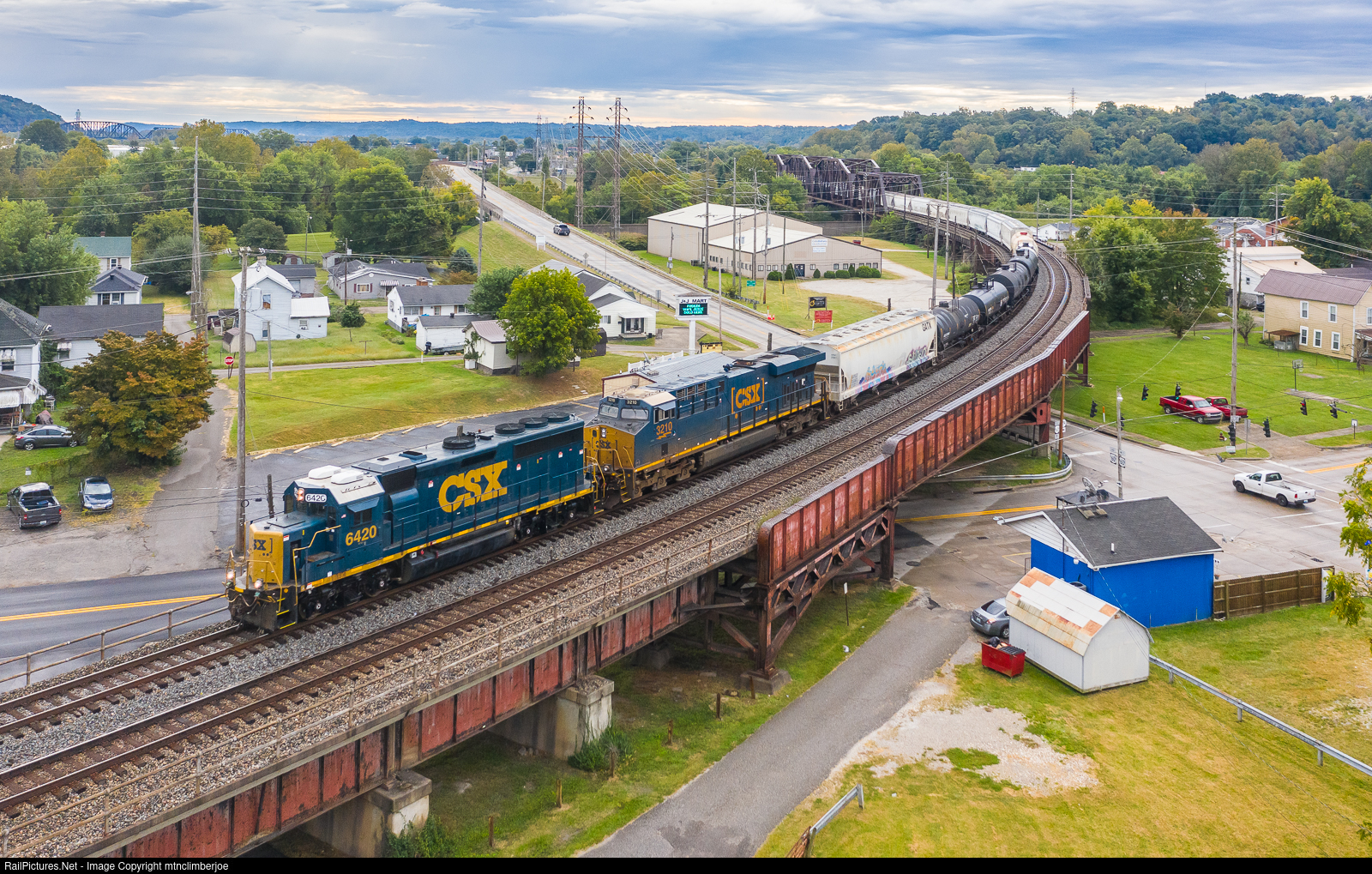 | CSX freight R206 rolls across the bridge that spans the Big Sandy River and then drops the track back to ground level at Big Sandy Junction in Catlettsburg, Kentucky. It's a dreary Saturday morning as GP40-2 6420 leads the train towards the yard in Russell. |
