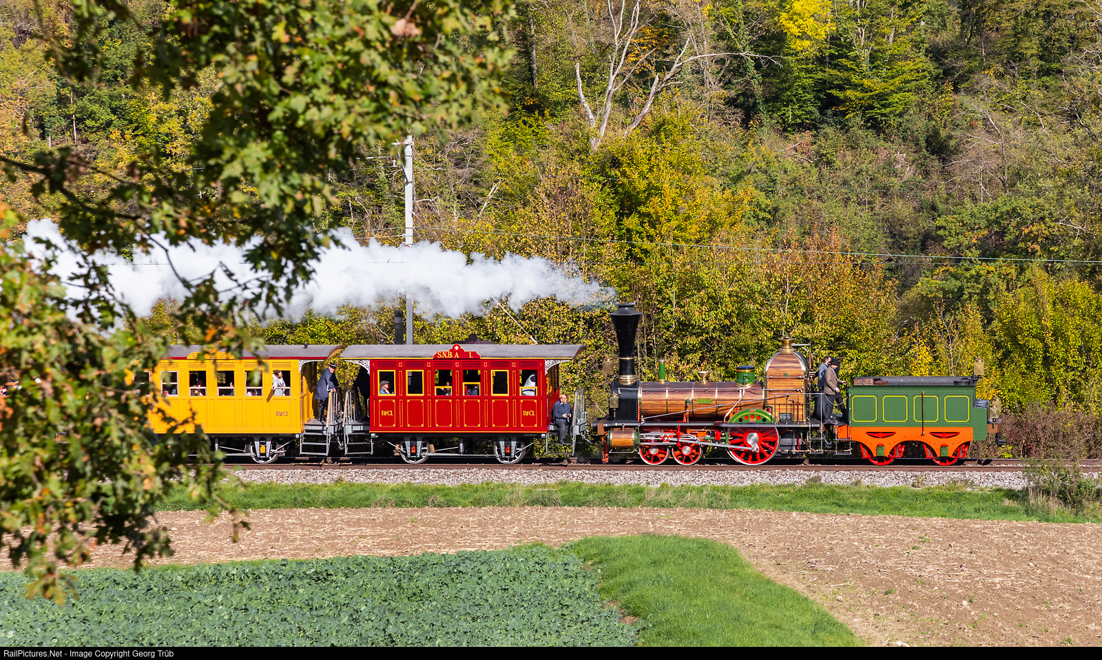 Steamlocomotive D 1/3 # 1 "Limmat", a replica built 1947 of the very first steamlocomotive in Switzerland, built in 1847 by Emil Kessler in Karlsruhe/Germany for the Schweizerische Nordbahn (SNB) from Baden to Zürich, with the cars of the "Spanisch-Brötli-Bahn", which was the nickname of this first swiss railway. The train run from Koblenz to Laufenburg along the Rhine river and is between Etzgen and Schwaderloch on the return journey. Just behind the bushes is the Rhine and the border, the trees in the background are in Germany.
