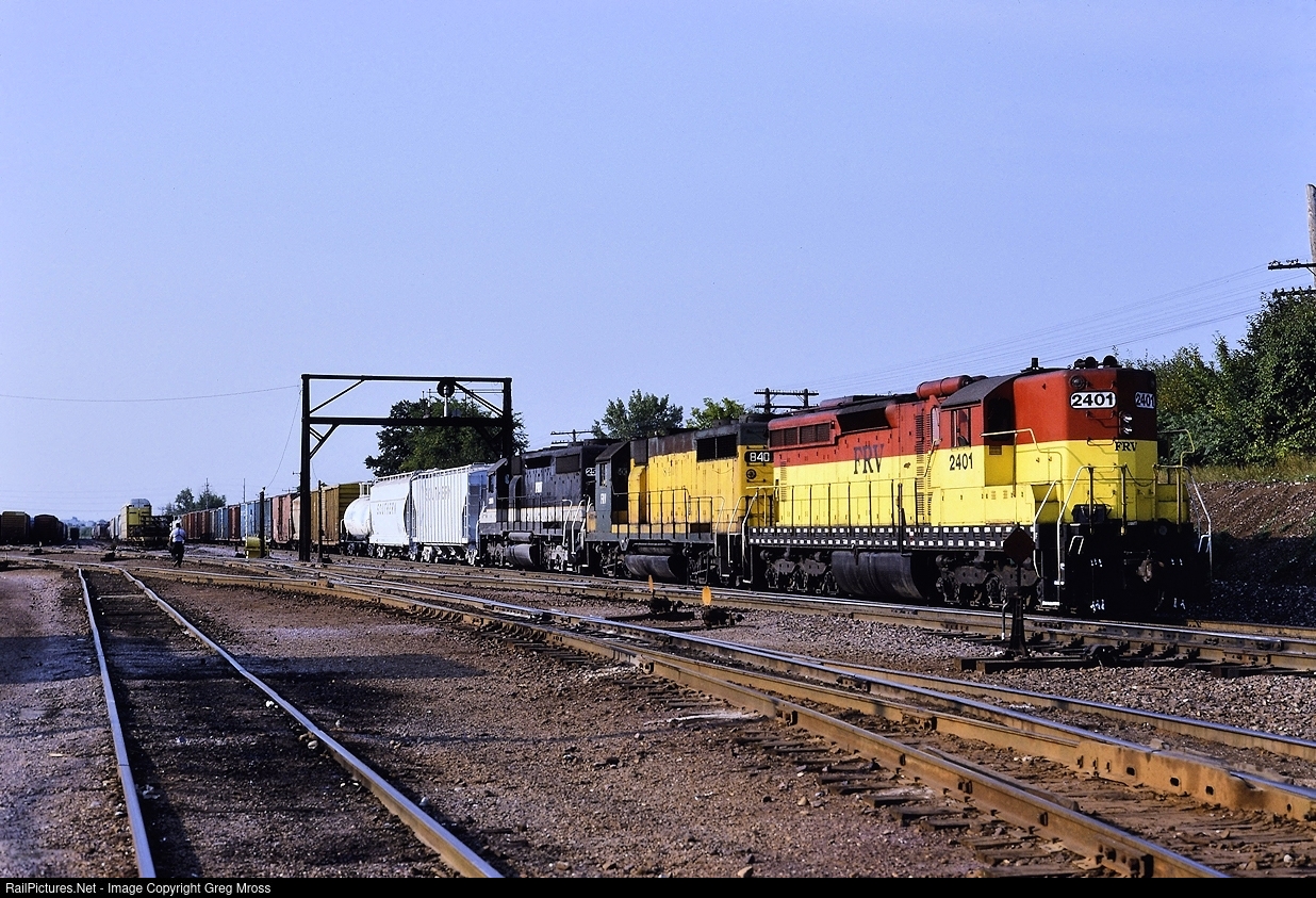 FRV 2401 holds the main while awaiting a crew change at CNW's Butler, WI yard in August of 1991. Only a handful of units were painted in FRV colors as this unremarked shortline, which operated the ex-CNW Airline from Milwaukee to Green Bay, was relatively short lived. Sister unit 2402 still survives at the Green Bay RR museum.