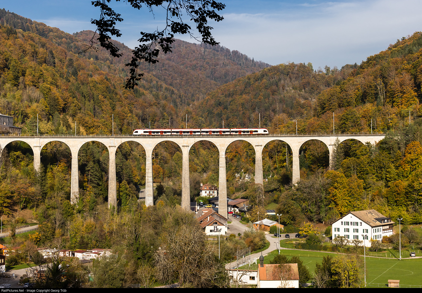 | "Flirt France" RABe 522 # 2.. of the SBB is crossing the 44 meter high and 237 meter long Combe Maran viaduct between Glovelier and St-Ursanne, running the Regio Express 18182 from Biel via Moutier-Delémont to Porrentruy. |