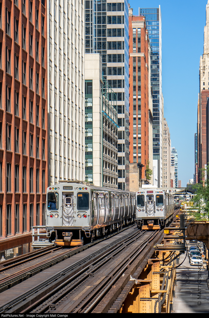 Two Chicago Transit Authority (CTA) trains are seen meeting north of Quincy station on the Union Loop. The train at right is a 5000-Series Pink Line train (Bombardier, 2009-2015), while the train at left is led by a former Skokie Swift 3200-Series (Morrison Knudsen, 1992-1994) - the walkway on the roof being a dead giveaway that a pantograph was formerly installed. Typically CTA cars are assembled in married pairs with another car of the same type, but interestingly no. 3448 here is paired with a non-Skokie Swift car!