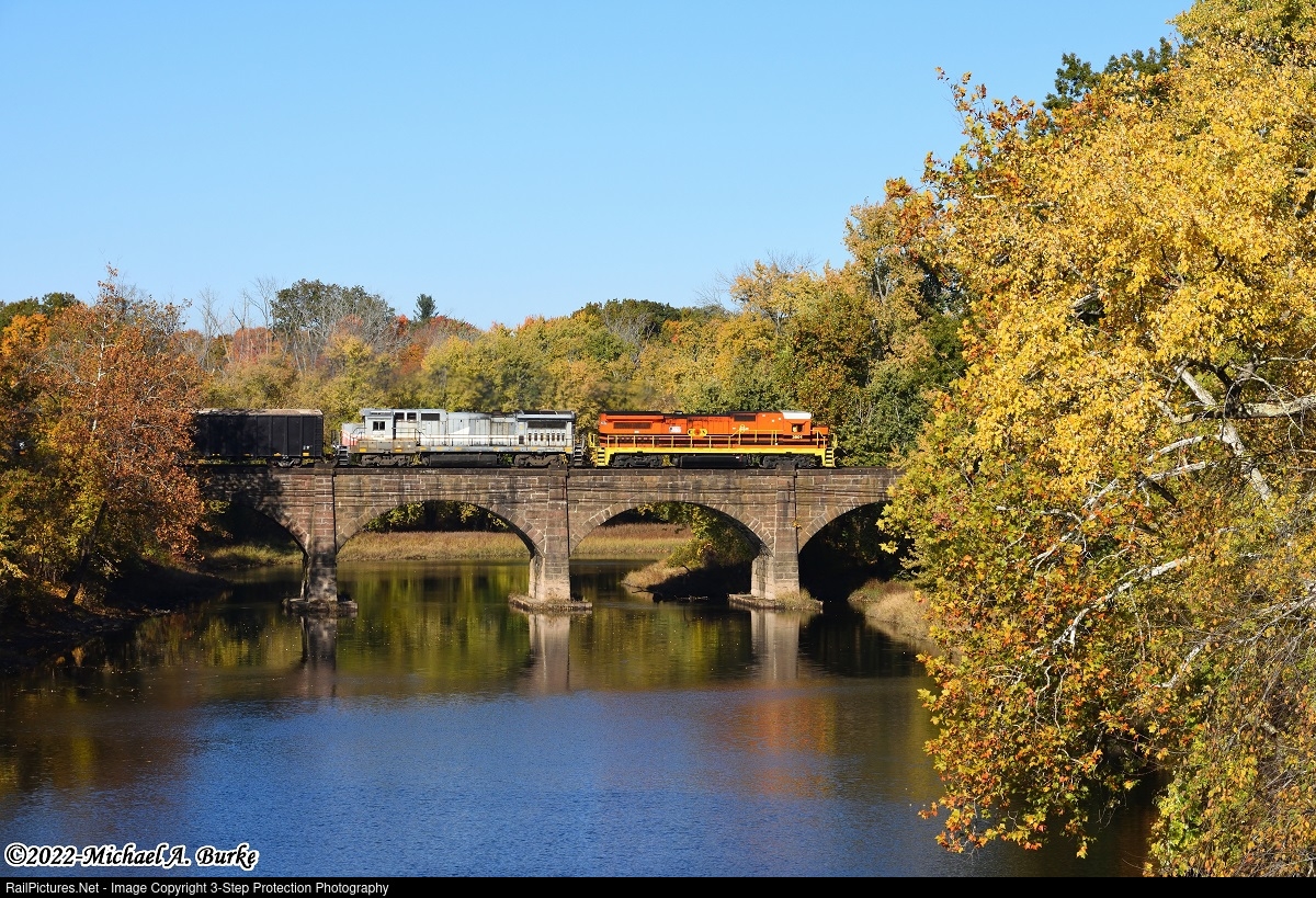 | It is a pleasant fall morning at the Farmington River Bridge in Windsor, as a pair of Connecticut Southern B39-8s are in charge of northbound train CSO-4 towards Springfield, MA. |