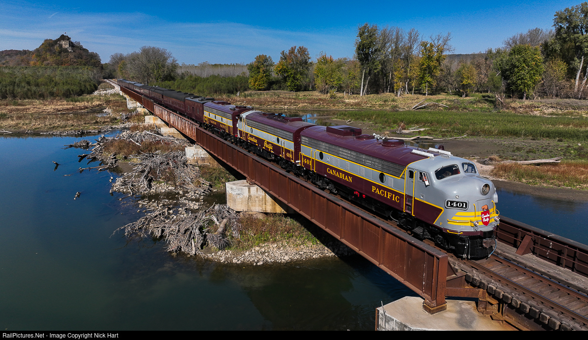 CP 1401, 4106 and 1900 roll south across the Turkey River with the royal Canadian Pacific business train in tow. The train departed Hastings, MN this morning and is enroute to Nahant Yard in Davenport, IA where it will overnight before continuing on to Kansas City, MO tomorrow morning.
