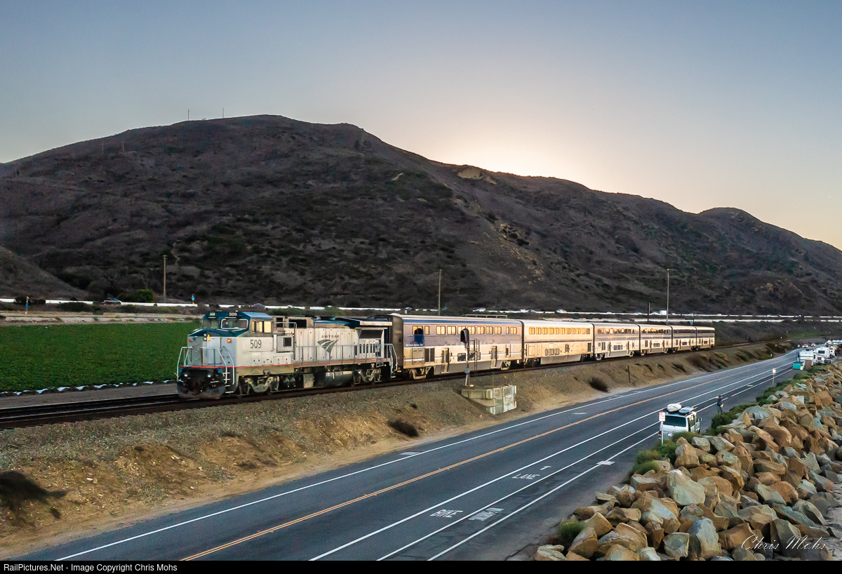 | A tip on Heads Up Coast Fans, lead to a early morning meeting with AMTK No. 509 pushing Pacific Surfliner No. 770 southbound to Los Angeles. One of the Charger Locomotives had to be pulled off a Surfliner and all that was available was the GE, which lead to this chance encounter. |