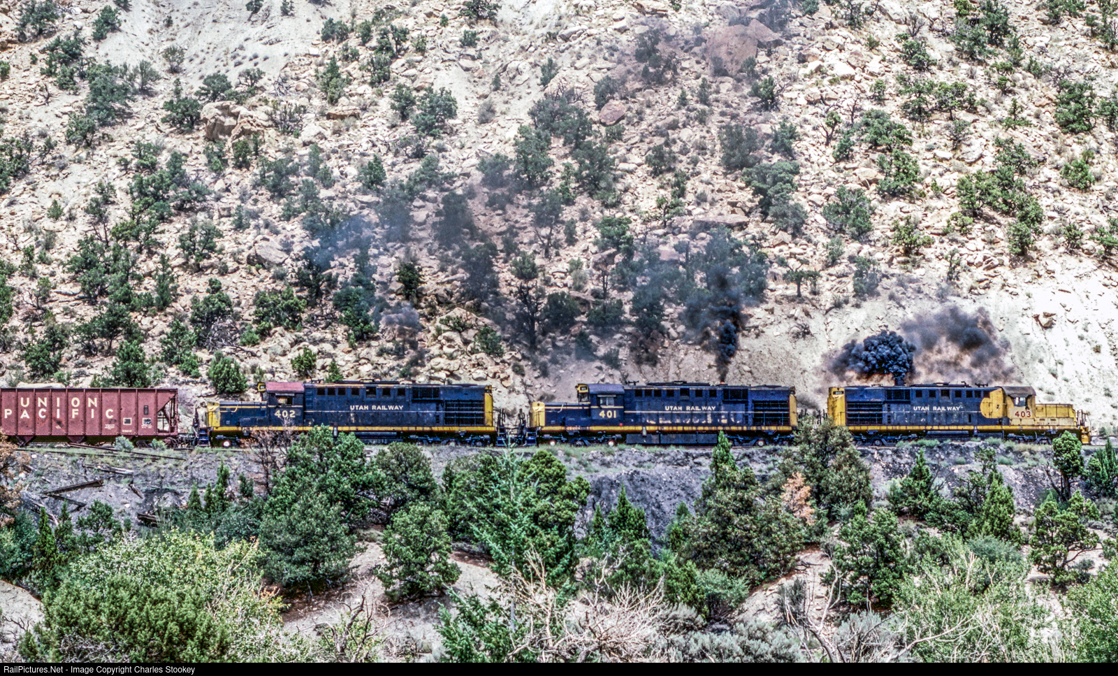 MOHRLAND UT Aug 22 1981 — Utah Railway RSD15s 403, 401 and 402, all in aging Santa Fe paint, smoke as they begin to pull on a cut of cars at the Mohrland Loadout. According to utahrails.net alligator 403 was built for the Santa Fe in May 1960 as no. 9847. It made its way via Precision National in Illinois to the Utah Railway as no. 402 on Oct. 28, 1975. It was placed in service on Oct. 31, 1975. Its last day of service on the Utah was May 13, 1982. It was retired May 14, 1982 and sold for scrap in November 1983 to Industrial Salvage & Metals (Salt Lake City UT) where it was scrapped in early January 1984. My photo.