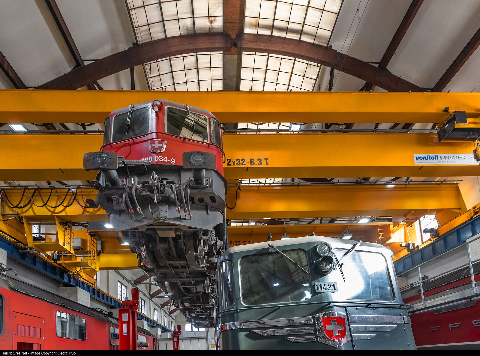 | Wild perspective in the large locomotive hall called "Cathedral" of the SBB industrial plant ("officine") in Bellinzona, at the open day on the occasion of the celebration of 175 years of Swiss Railways. The 100-meter-long, 30-meter-wide and 20-meter-high hall was built in 1919. SBB Cargo's 120-ton Re 620 # 034 (Re 6/6 # 11634) hovers above SBB Historic's Ae 6/6 # 11421 "Graubünden" on the yellow hall cranes.