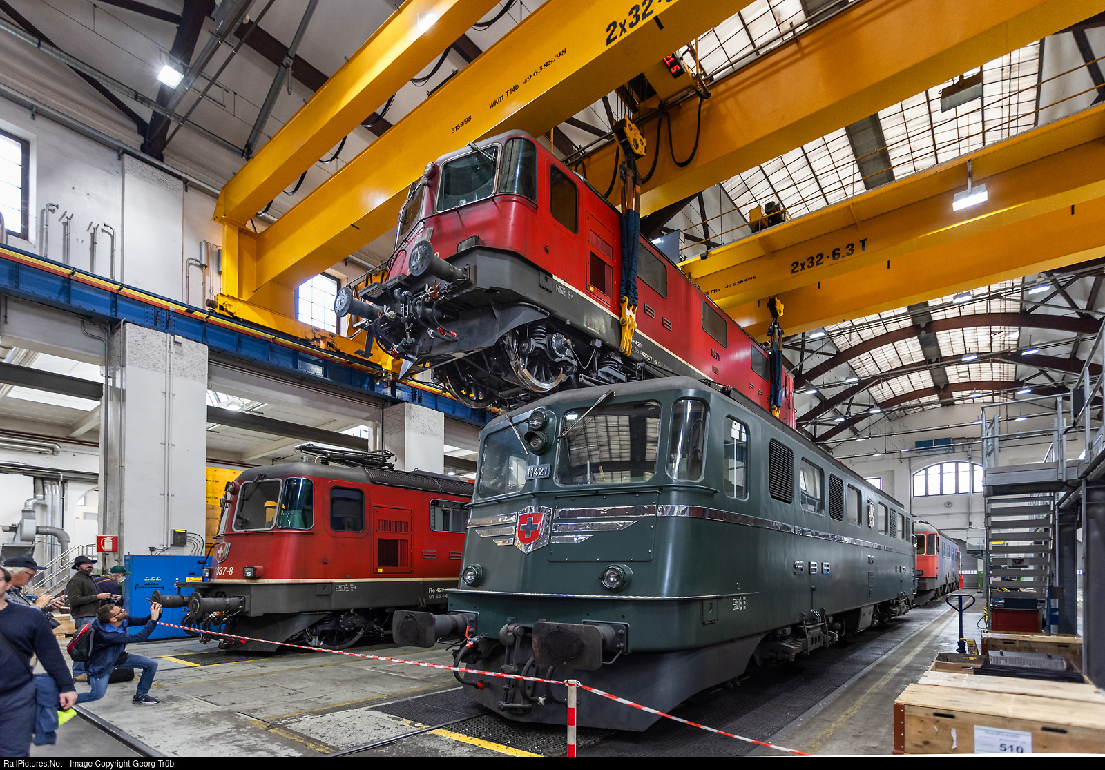 Wild perspective in the large locomotive hall called "Cathedral" of the SBB industrial plant ("officine") in Bellinzona, at the open day on the occasion of the celebration of 175 years of Swiss Railways. The 100-meter-long, 30-meter-wide and 20-meter-high hall was built in 1919. Above the Ae 6/6 # 11421 "Graubünden" of SBB Historic hovers the 84 ton Re 420 # 271 (Re 4/4 II # 11271) of SBB Cargo, on the left is Re 420 # 337.