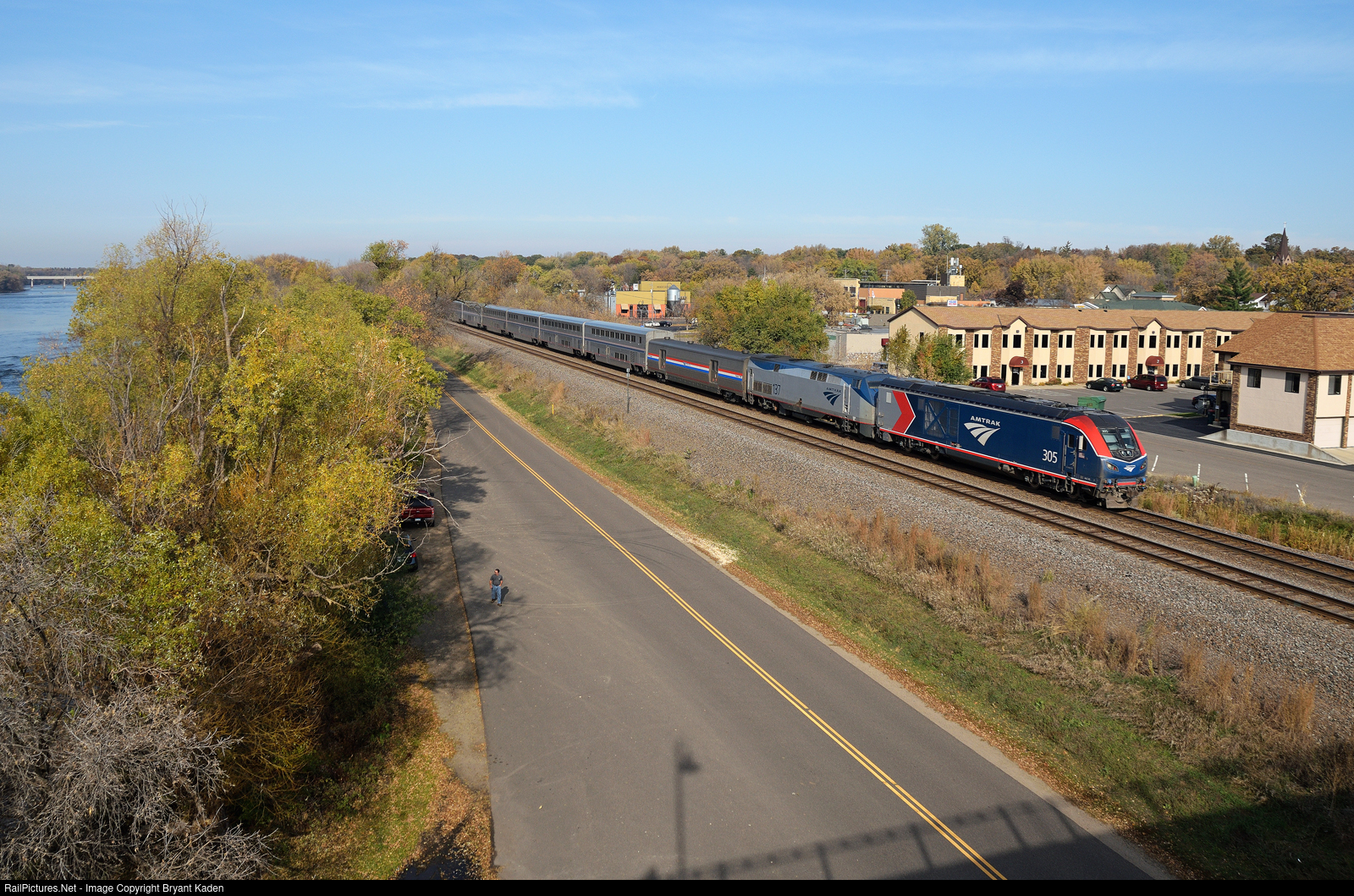 | The eastbound Empire Builder is running close to 5 hours late on a pleasant October morning as it glides along the Mississippi River, nearing its next station stop in St Cloud. |