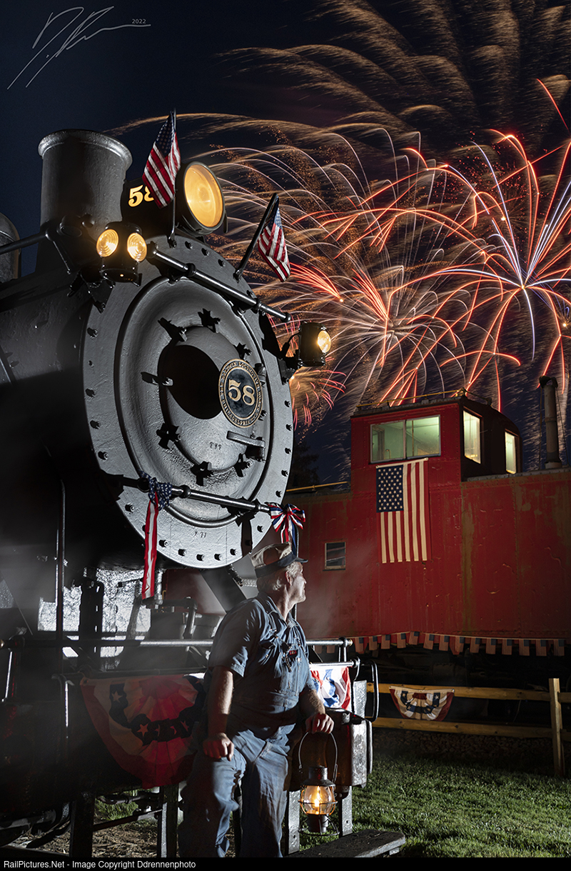 The Wilmington & Western Railroad annually brings its train to the town of Hockessing, Delaware for their 4th of July Fireworks display. The crew requested to have the locomotive lit up for some of the photo ops for the evening, so to Delaware I went! Crew member Jim Hogan is seen here with his locomotive taking in the show.