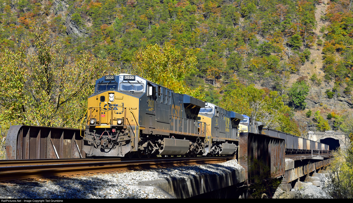 “Cat Ears, Revisited” Destined for Shaw Mines, PA, coal empties on No. 1 Main exit the 1592-foot Graham Tunnel (in Allegany County, MD) and immediately cross Kessler Bridge into Morgan County, WV, on B&O’s Magnolia Cutoff. E737 originates at the Consol Marine Terminal in Canton (Baltimore), MD.
