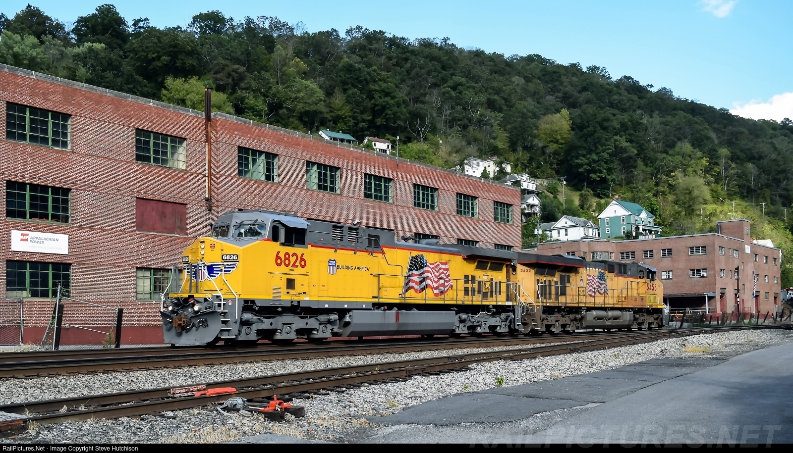 | Working far from home, UP 6826 and 5455 are in Pusher Service on the Norfolk Southern Pocahontas District. They are running westbound at Welch WV just about to enter the east portal of Welch Tunnel. |