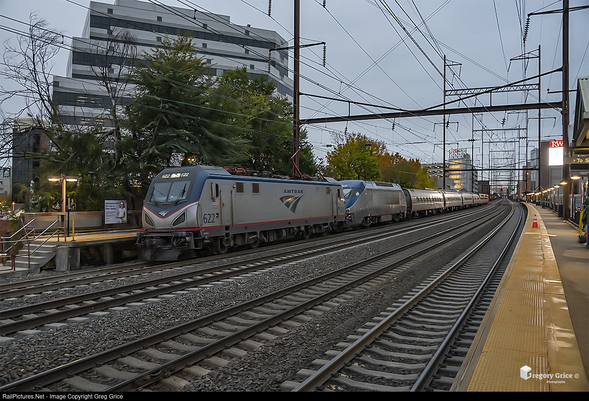 On the evening of October 23th, 2022, Amtrak's eastbound Crescent is seen making its local station stop on the NEC at New Brunswick, NJ with ACS-64 622 leading newly released Bombardier HHP-8C Non-powered Control Unit (NPCU) #90691.