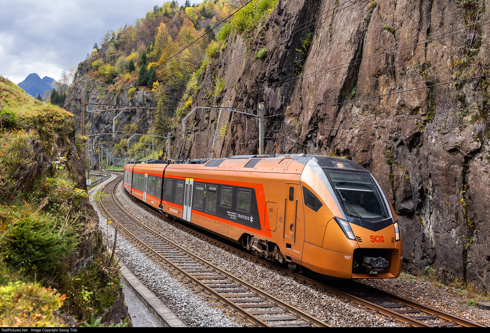 | "Traverso" train RABe 526 # 107/207 of the Südostbahn (SOB) is running the TRENO GOTTARDO IR 2324 of the line IR 26 from Locarno over the Gotthard mountain line to Lucerne-Olten-Basel, between Gurtnellen and Amsteg-Silenen. |