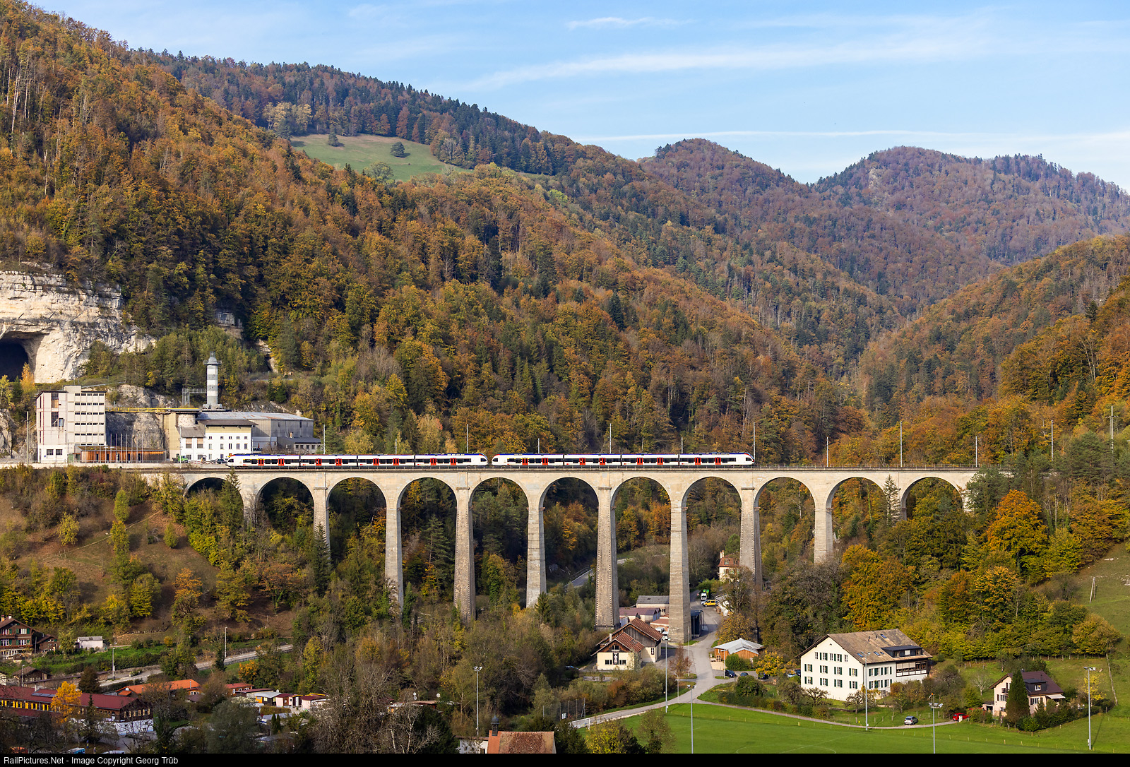 | Two "Flirt" RABe 523 trainsets of the SBB are crossing the 44 meter high and 237 meter longe Combe Maran viaduct between St-Ursanne and Glovelier, running the S 3 service 17363 from Porrentruy via Delémont-Laufen-Basel-Liestal to Olten. |