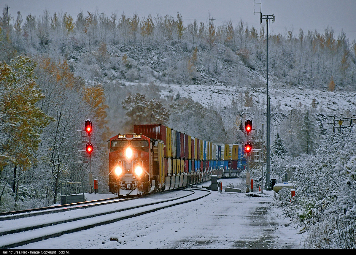 The first snows of the season fall as some fall color hangs on across the landscape while a CN container train rolls north for Cananda.