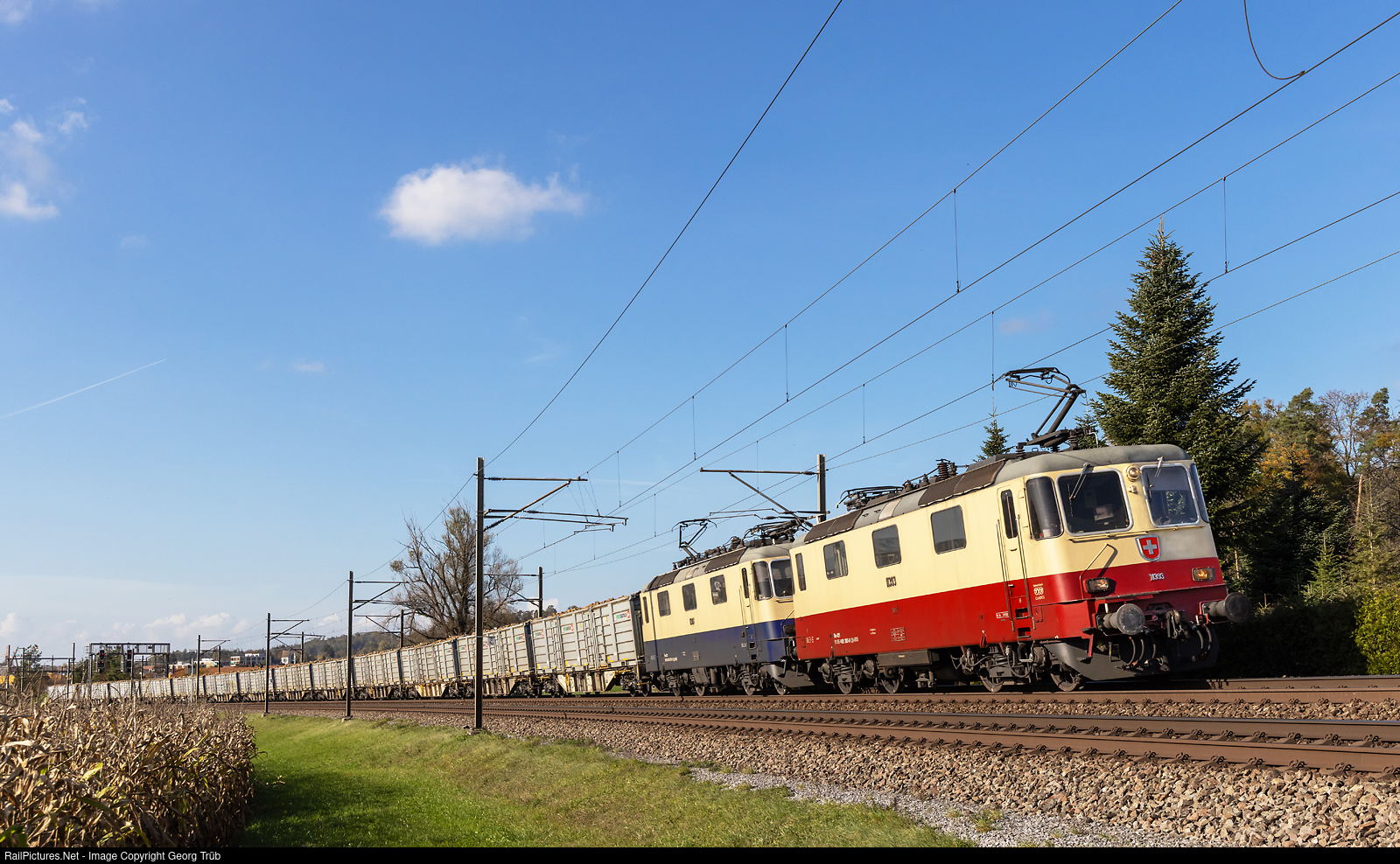 | Re 421 # 393 (Re 4/4 II # 11393) in the TRANS EUROP EXPRESS colors and Re 421 # 387 (Re 4/4 II # 11387) in the RHEINGOLD colors of the International Rolling Stock Investment AG (IRSI) in multiple control are pulling the train 69455 of the BauRail railway with sugar beets from Lupfig via Brugg-Regensdorf-Kloten-Winterthur to Islikon (Frauenfeld sugar works) between Bassersdorf and Effretikon. |