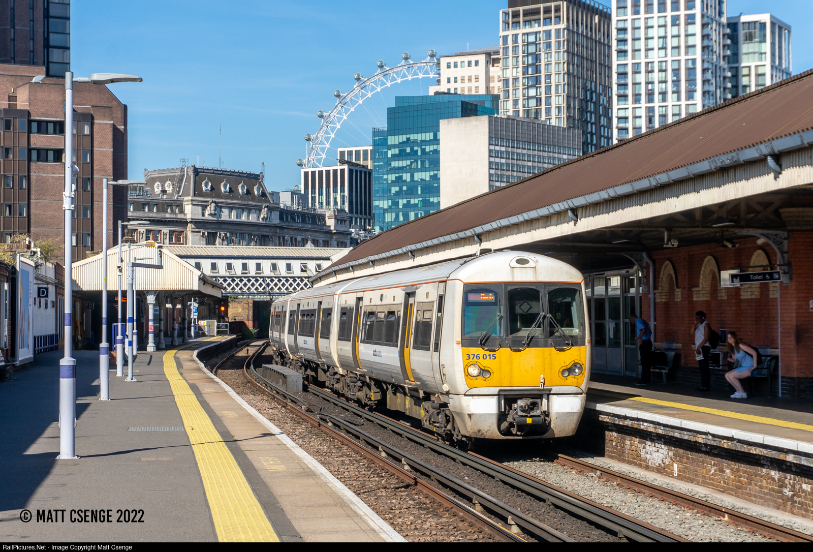 Southeastern class 376 Electrostar no. 015 (Bombardier, 2004-2005) is seen arriving at Waterloo East Station. The façade of Waterloo Station itself, as well as the London Eye, can be seen in the background. |