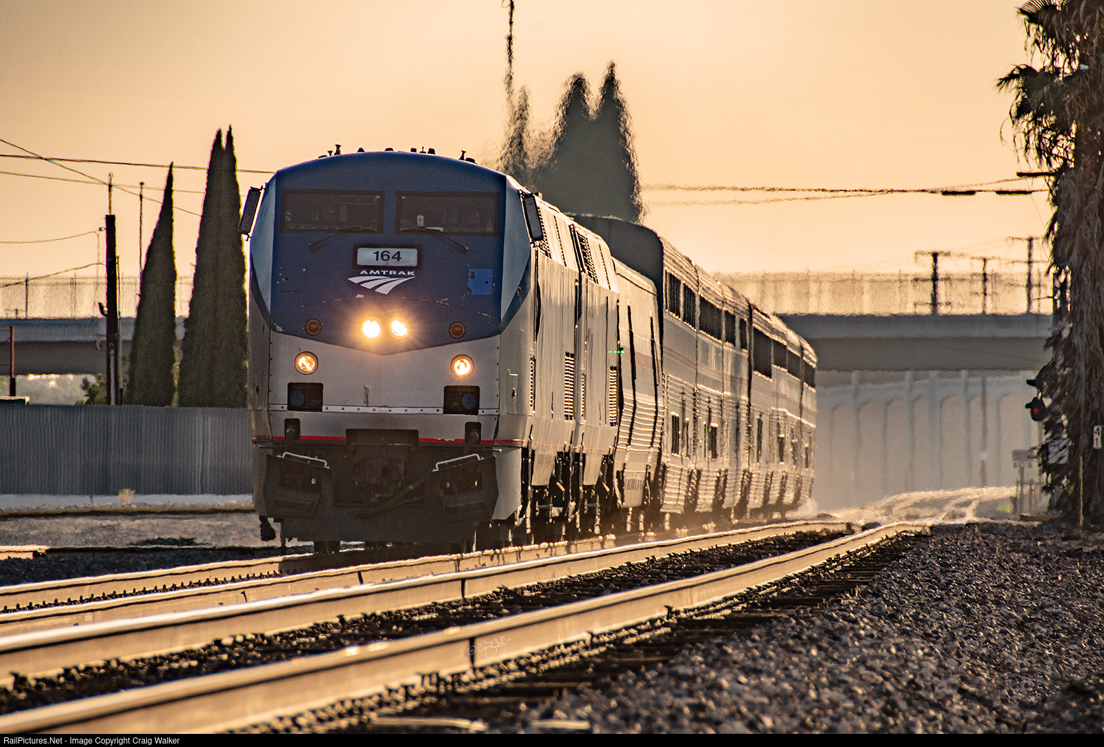 Running 10 minutes late and leaving the setting sun behind, Amtrak train 4, the eastbound Southwest Chief, approaches Atwood, a junction of the BNSF’s San Bernardino Sub and Metrolink’s Olive Sub. A pair of P42DCs, 164 and 127, are pulling their eight-car-train from Los Angeles to Chicago. (Placentia, California – July 28, 2022)