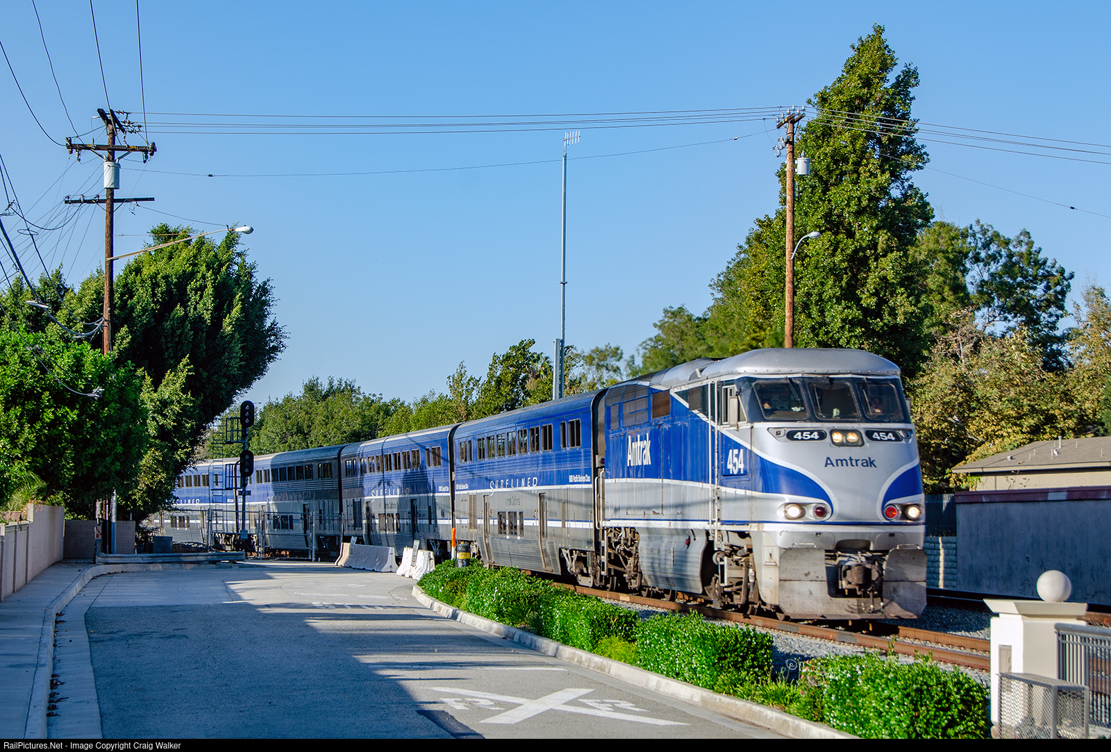 Amtrak train 582, a Pacific Surfliner, has just crossed into Santa Ana as it heads from Los Angeles to San Diego. AMTK F59PHI 454, built in June 1998, is pulling this six-car train as it exits Santiago Park, on the Santa Ana-Orange border. (Santa Ana, California – October 14, 2012)