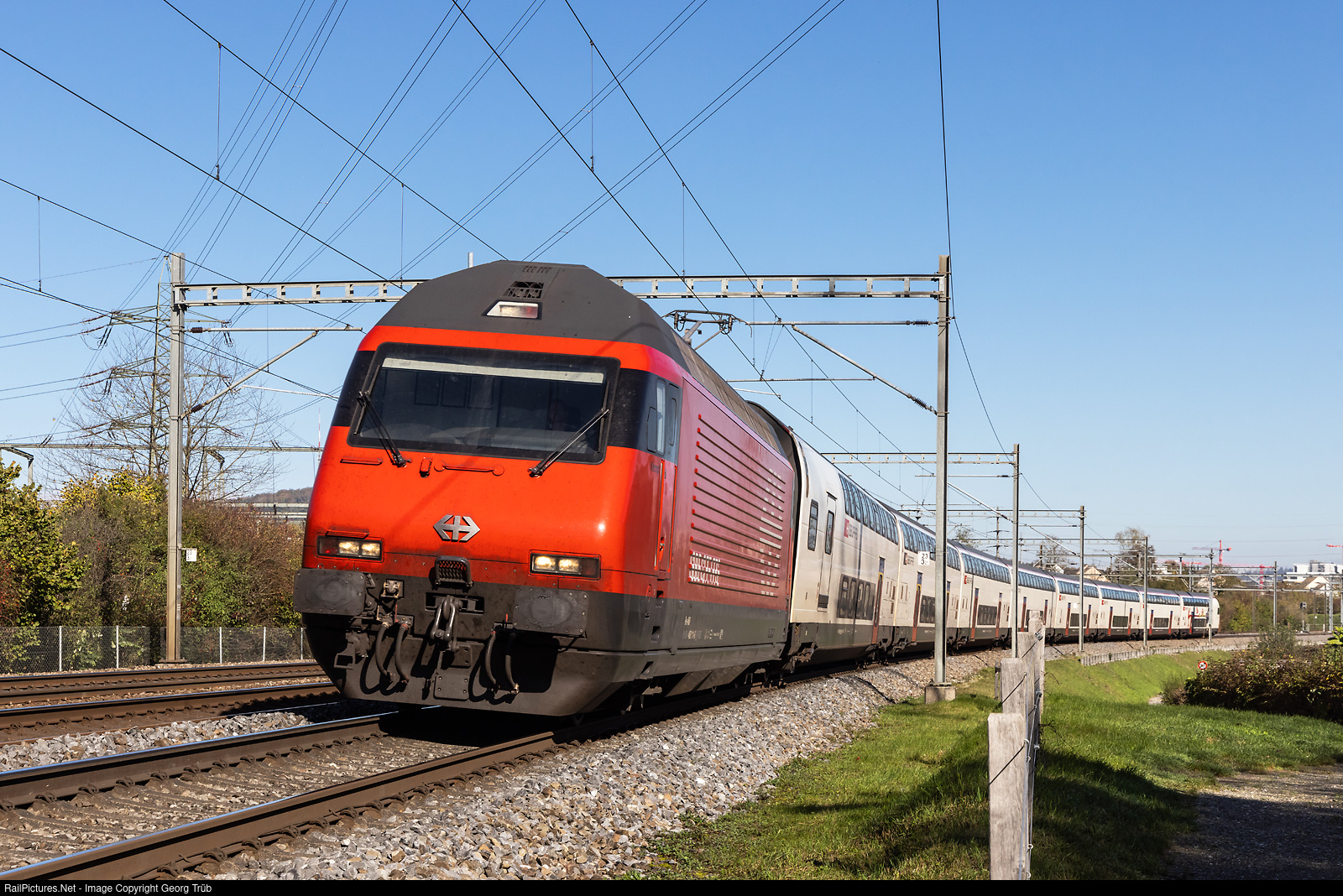 | Re 460 # 111 "Kempt" with the doubledeck "IC2020" push-pull train IR 2118 from Constance via Weinfelden-Frauenfeld-Winterthur-Zürich-Zug to Lucerne, between Winterthur and Winterthur Tössmühle. |