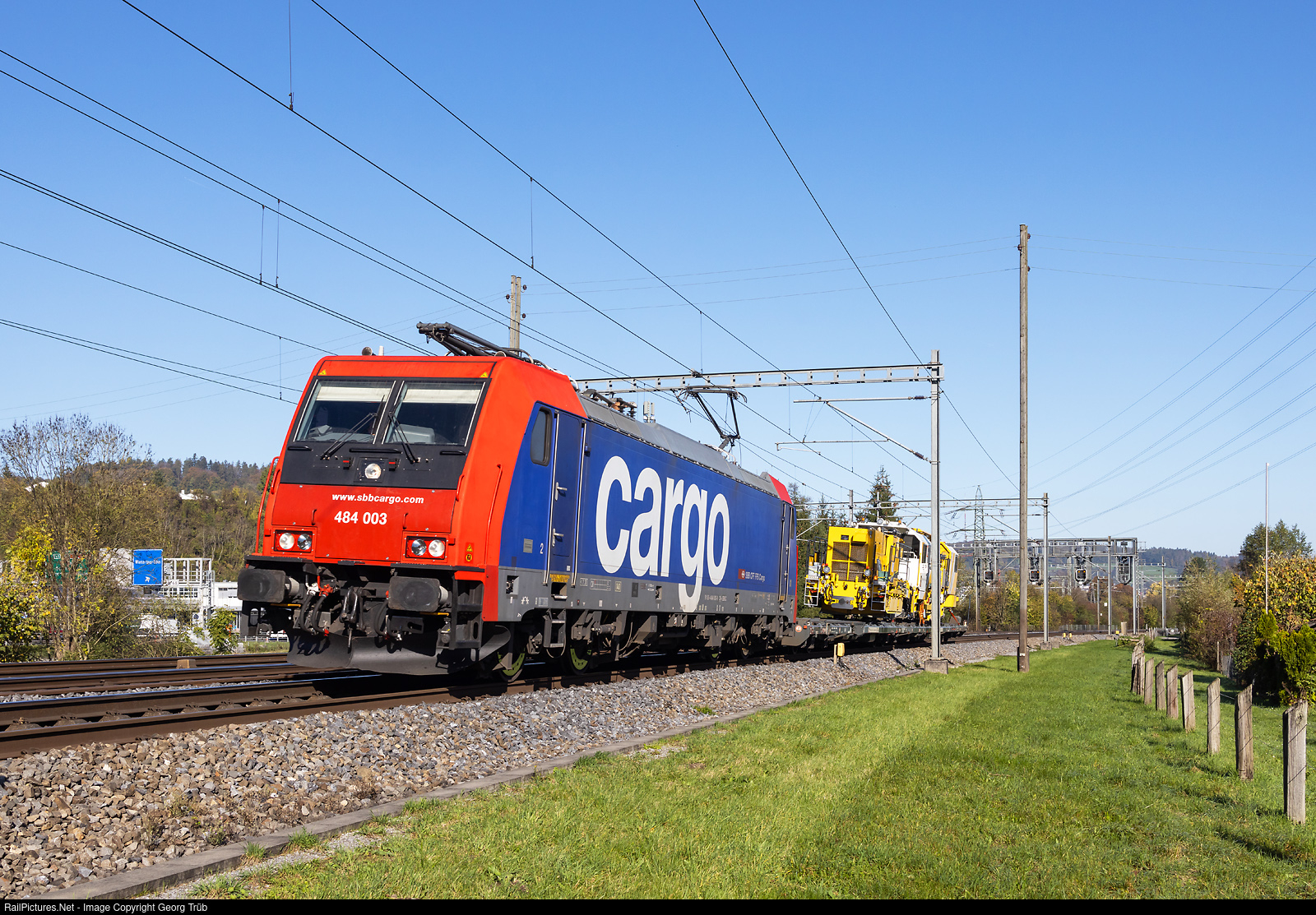 | Bombardier TRAXX F140 MS Re 484 # 003 of the SBB is pulling the short freight 69140 from Wil freight yard to Dietikon, running through Winterthur Tössmühle. On two low load cars is the new R22RD-1 grading and compacting machine of the Sersa company for 1 meter gauge transported. The machine was probably in use on the Frauenfeld-Wil Bahn (FW, part of the Appenzeller Bahnen) before. |