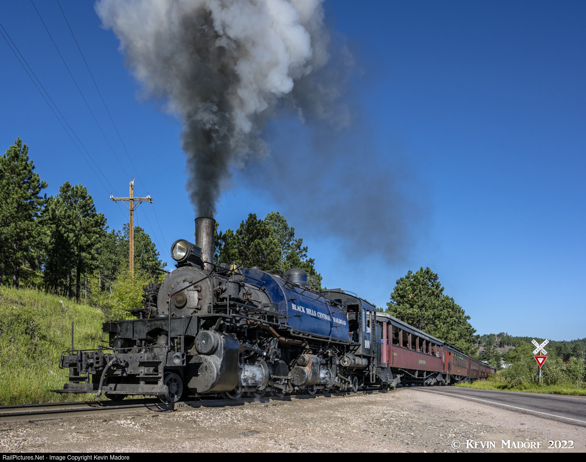 Sanding the flues. Black Hills Central Railroad Locomotive #108 pours out a strong, salt and pepper plume as she hauls the first "1880 Train" of the day past the second crossing at Old Hill City Road (MP .5), just outside Hill City, SD. This is about the most smoke you'll ever see from this locomotive as normally, she runs clean-stack nearly all of the time. On this particular morning, the air was cool, yielding a steamy, white plume as the train approached the grade crossing and just as they entered the roadway, the crew began to sand the flues. On oil-burning locomotives such as the 108, this procedure involves introducing sand to the firebox when the locomotive is producing a strong draft, such as on a steep grade like you see here. That sand is pulled through the boiler flues by the draft, and effectively sands off any soot products which have built up on the inside of the tubes. Cleaning the flues in this manner, improves heat transfer and engine efficiency. It also makes for a very dark exhaust plume for at least a few seconds. Although the passengers in the open cars will likely get "dusted" with sand grains, my experience on this train is that it doesn't soil clothing. As this is happening, the narrator on the train typically warns the passengers to expect a little dusting.
