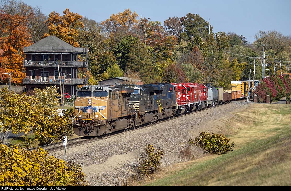 UP 5275 leads NS 110 west with a colorful consist. Behind the 5275 is NS 9944, NS 8103 the N&W heritage unit then in tow three very clean CP units. SD40-2 6043, SD40-2F 9021 and SD60 6303.