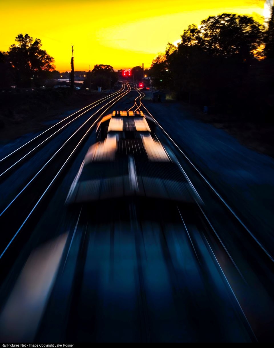 | ES40DC 7646 and AC44C6M 4024 pull a string of cars forward at Old yard in Spencer NC. As the sun sets over the horizon, it casted a fiery orange glow on anything reflective. |