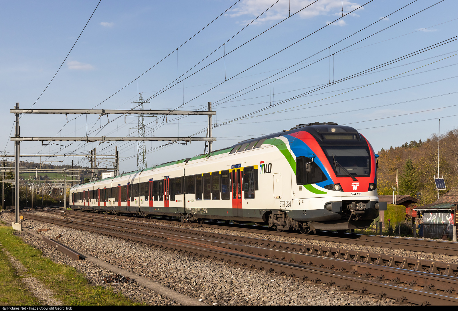 | "Flirt" RABe 524 # 116 of the TILO (Treni Regionali Ticino Lombardia) is on the transfer run 97454 from Romanshorn freight yard via Faruenfeld-Winterthur to Bassersdorf (later Effretikon), running through Winterthur Tössmühle. |