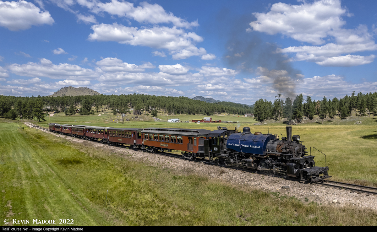 Headed for Oblivion. Somewhere between Mile Markers 3 and 4, the Black Hills Central's 11:30 AM train is heading east through what's known as Palmer Gulch, with Locomotive #108 on the point. As the train eases into this wide open field, it is initially drifting slightly downgrade, but as you see it here, that grade has just reversed and the presence of a little smoke from the stack indicates that the uphill climb to "Oblivion" has begun. Oblivion, about half a mile ahead, is the historic site of a logging camp that dated back to the late 1800s. In more recent times, Oblivion was the original destination for the Black Hills Central Railroad, when it first started tourist operations in 1957 as a narrow gauge line. In fact, there is a narrow gauge wye that still exists at Oblivion and it can be seen from the train as it passes through.