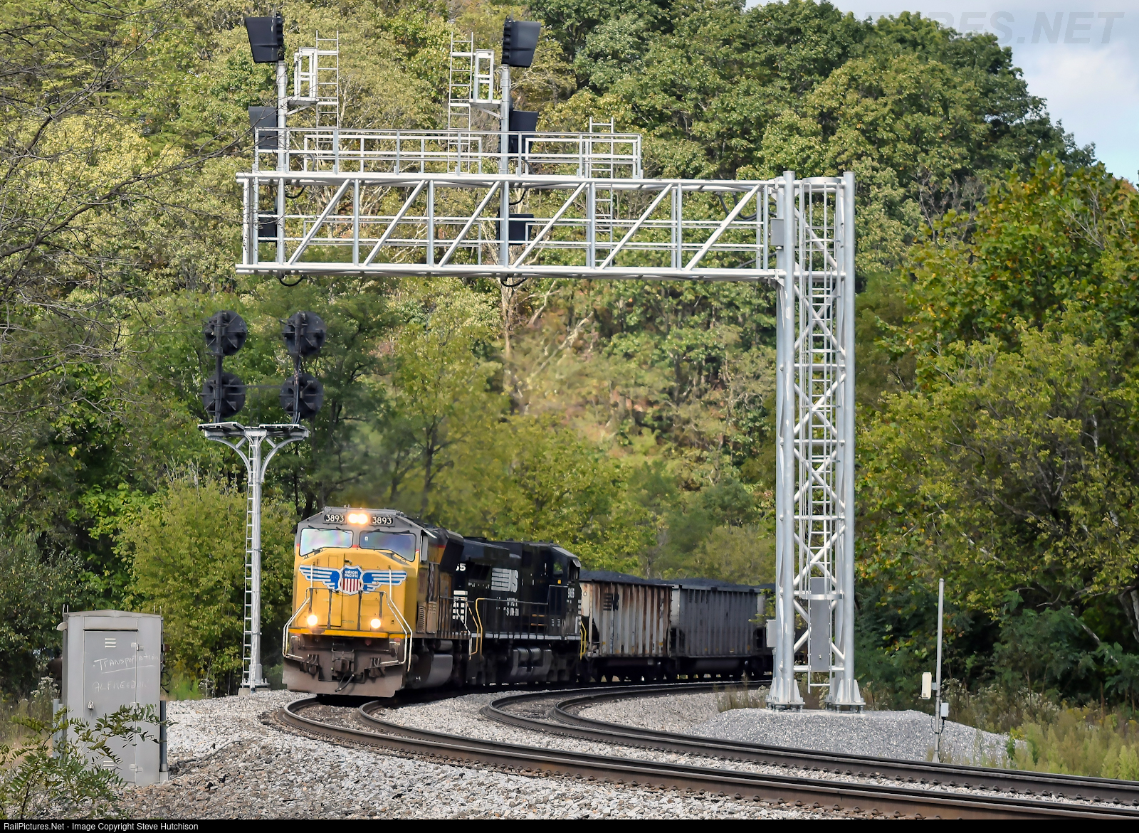 | UP 3893 leads an eastbound coal train past the N&W Color Position Light signals at Bluefield Virginia. The CPL signals will not be in service much longer as the new PTC signals are in place. |