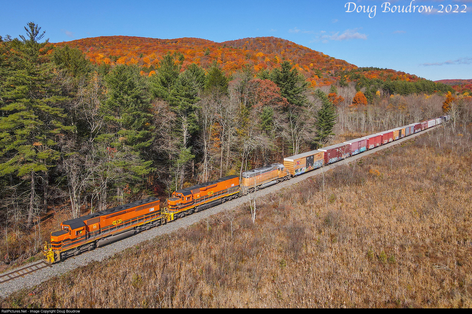 On a perfect Autumn day, New England Central 611 is seen heading South through Leverett, MA, and passing the 1,269-foot Mount Toby which is still showing some peak foliage. The lead locomotive is NECR 3474 which was built in January 1969 as an SD45 for the Chicago, Burlington and Quincy. Although still sporting the classic carbody and flared radiators its rebuild classification is an SD40M-2.