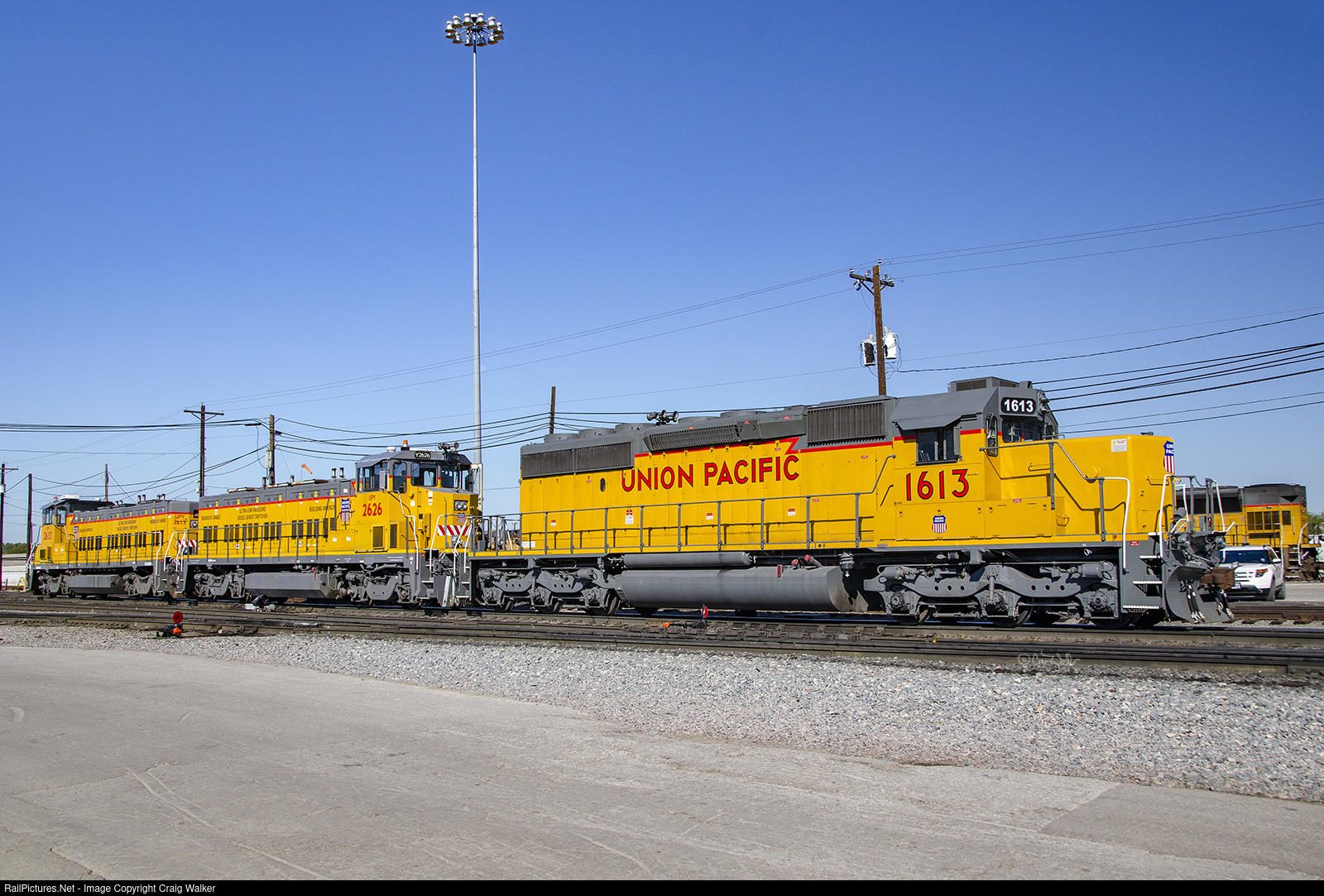 Union Pacific Railroad's Davidson Yard features several sets of power working the hump yard at one time, as the yard is that large. One of those sets on this day was UP "snoot" SD40-2 (UP calls them SD40Ns now) 1613 (the former UP 3372), teamed with UPY RP20BDs 2626 and 2613. (UP calls these RP20BDs "RP20GEs," as UP is apparently unable to use the builders' model designations for some reason.) All three of these locomotives are extremely clean! (Fort Worth, Texas – October 16, 2011). Photographed on railroad property with permission and full PPE.
