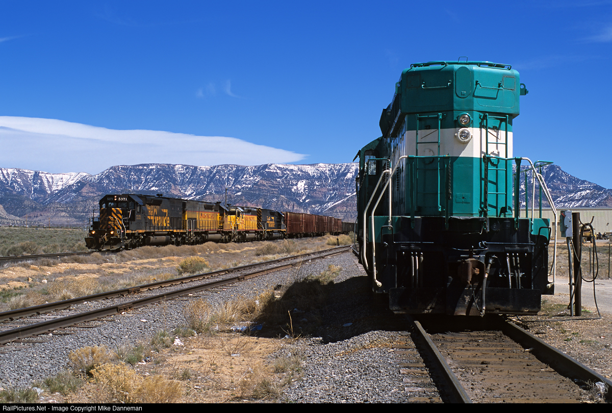 Union Pacific’s LJP45 dirt train local rolls westward from the rotor at East carbon Development Corporation (ECDC) landfill at East Carbon, Utah, on April 7, 2005. The local is led by Rio Grande EMD SD40T-2 No. 5371, and is passing one of ECDC’s EMD SD9s (they have two) with Southern Pacific ancestry.