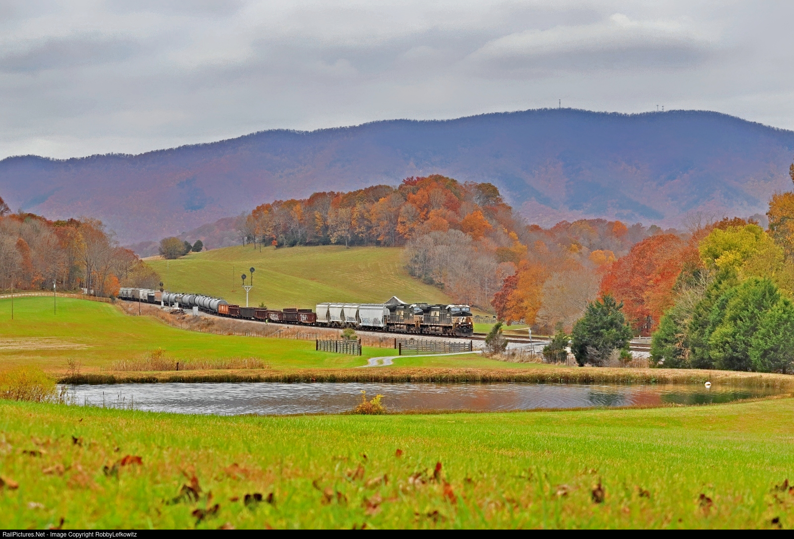 Last touch of fall: NS 12Z chugs north through Arcadia, VA in the mid-morning hours as it heads into the siding to meet an incoming southbound NS 11Z. Of note, this siding is rarely used for meets because of its small length, but with both 11Z and 12Z being under 6,000 FT the location worked well for a change.