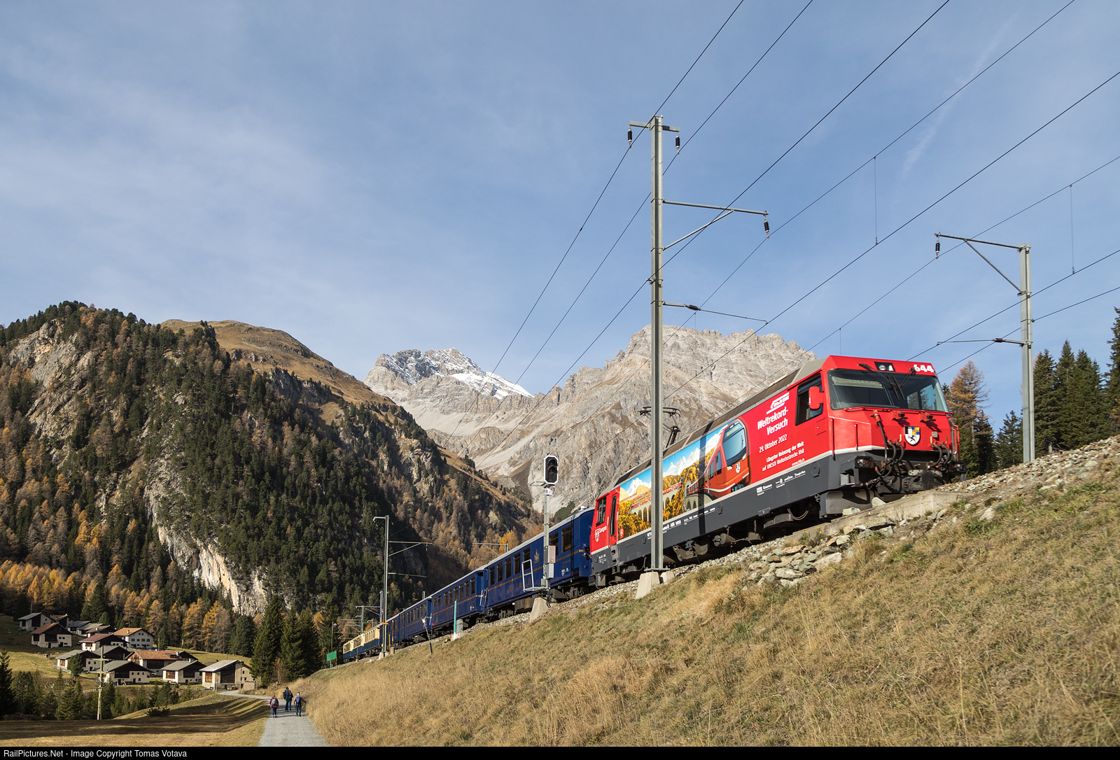 Ge 4/4 III # 644 of the Rhaetian Railway, in the special paint scheme for the world record trial on the same day for the longest passenger train, is pulling the passenger extra train for invited guests from Chur to Preda for the start of the world record passenger train, entering Preda.