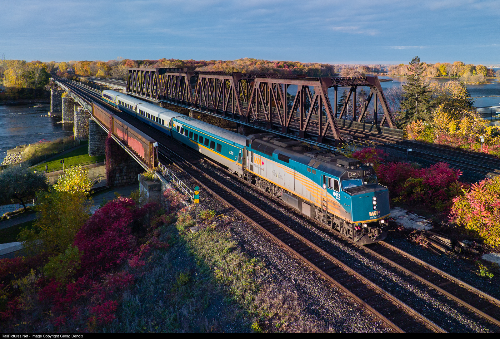 | VIA corridor train 22 makes an early-morning entry to the island of Montreal at Sainte-Anne-de-Bellevue with F40PH 6413 leading a 4-car consist of LRC cars, with CP's Vaudreil sub in the background. |