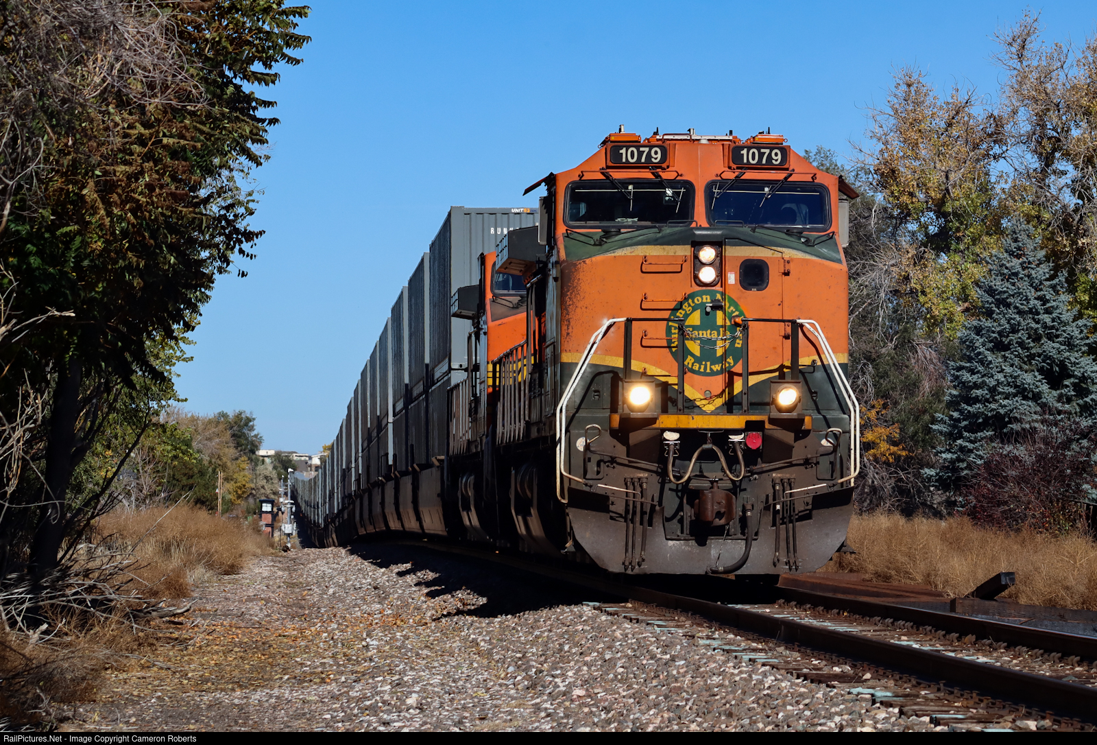 | BNSF 1079 leads a southbound repositioning train from Portland, OR bound for Los Angeles, CA passes through Louisville, CO with clear skies. |